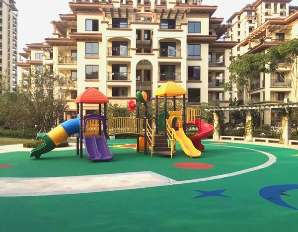 紹興 香郡園兒童游樂場竣工, 包括一片800M2的彩色塑膠場地和一套大型兒童組合滑梯。塑膠場地圖案新穎, 色彩鮮艷,深得業(yè)主和開發(fā)商的贊揚!